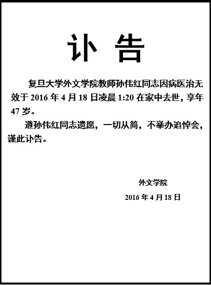 孙伟红同志讣告