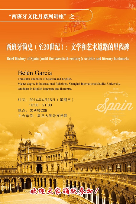 西班牙文化月即将拉开帷幕啦!学院邀请到西班牙驻沪总领事馆文化处奉上六场精彩讲座,主题涵盖西班牙文学、文化、电影、音乐等。第一场讲座如期而至:“西班牙简史(至20世纪):文学和艺术道路的里程碑”,主讲人Belen Garcia,毕业于上外国际关系专业。4月16日(周三)18:30在文科楼209,期待参与!