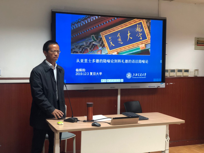 12月3日下午14:30-16:30,上海交通大学长聘教授、博士生导师、中国英汉语篇分析专业委员会秘书长杨炳钧教授应邀前来我院讲座。讲座由英语系沈园教授主持,汪洪章教授等部分老师参与交流。424会议室座无虚席,吸引了来自不同专业对隐喻理论感兴趣的听众。