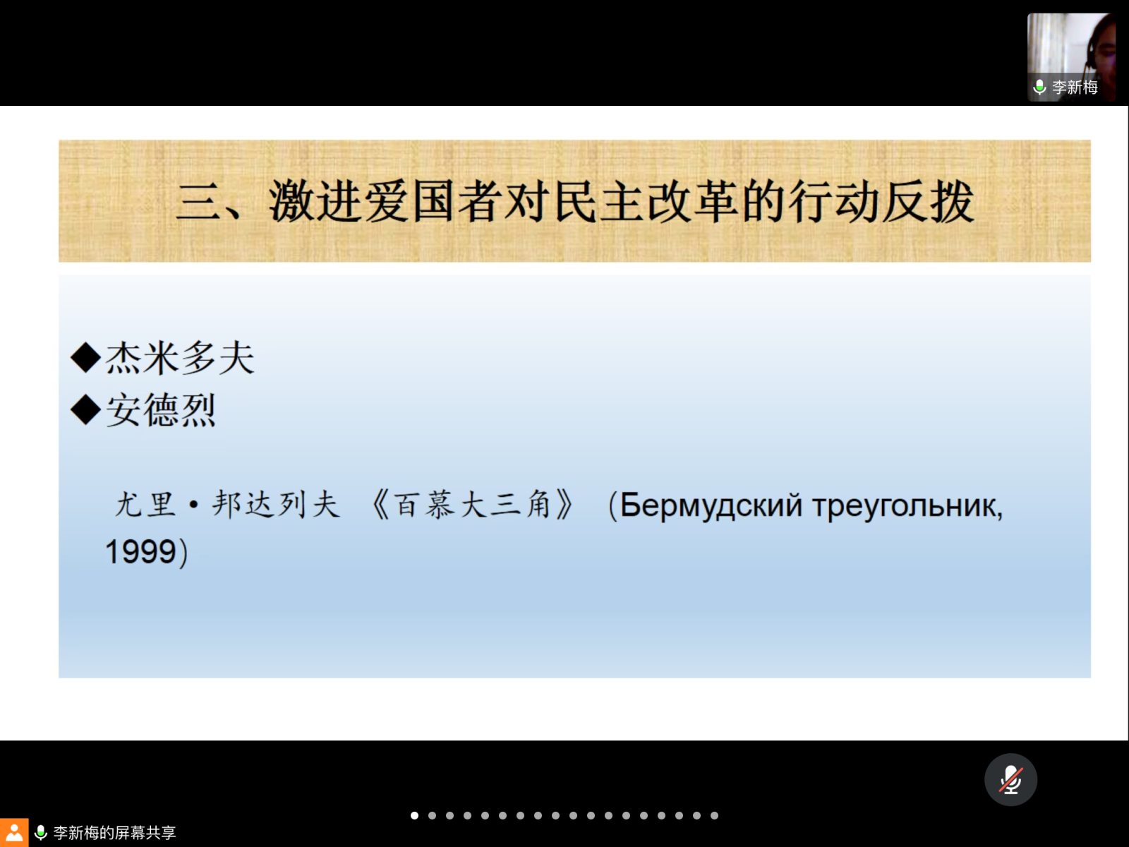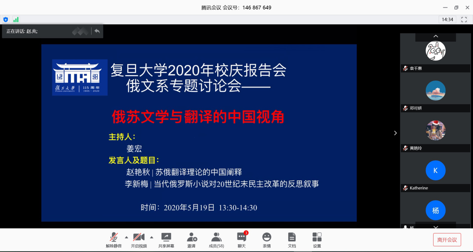 2020年5月19日,平博在线注册,平博(中国)外文学院俄文系2020年校庆学术报告会暨专题讨论会“俄苏文学与翻译的中国视角”成功在线举办。会议由俄文系主任姜宏教授主持,俄文系教师赵艳秋、李新梅分别进行报告。60多位师生参会。