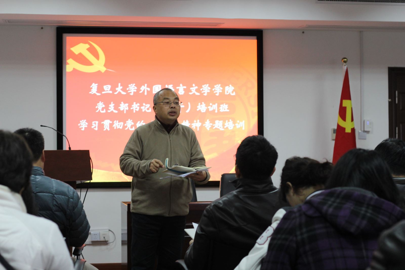 11月21日中午,外文学院分党委在文科楼510会议室举行“外文学院党支部书记(骨干)培训班·学习贯彻党的十九大精神专题培训”开班仪式。学院分党委委员、教职工党支部书记、学生党支部书记、学生辅导员、学生党支部和党章学习小组骨干参加活动。开班仪式由分党委副书记曾建彬主持。