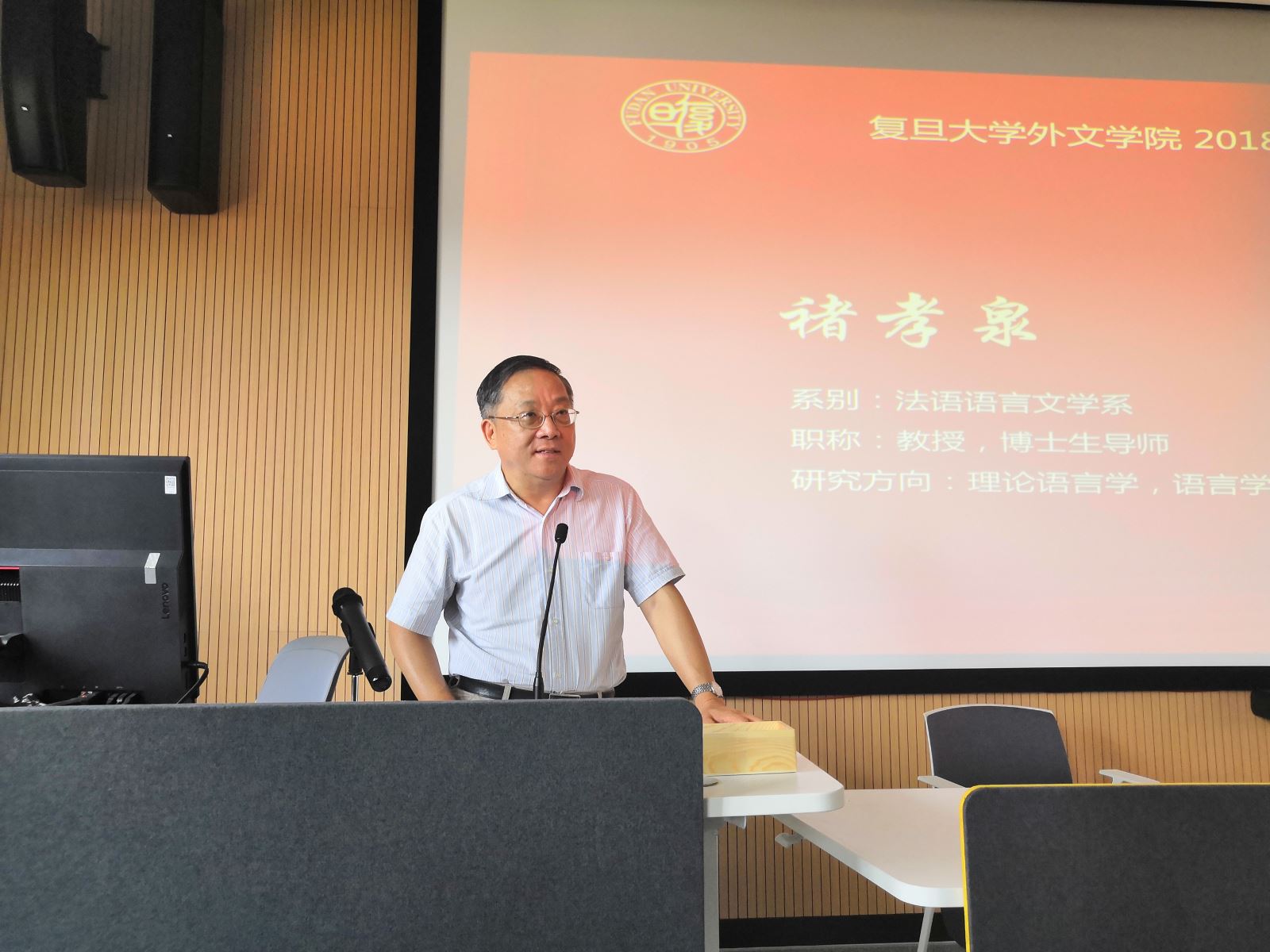 褚孝泉教授指出:新生要了解复旦和复旦人肩负的历史责任,向陆谷孙先生等老一辈大师学习,将思想独立、不随波逐流的复旦精神传承下去;要注重提高自身外语水平,要多看外语书,多读原文、原著、原典;要注重学术道德和版权观念,培养良好的学术规范。