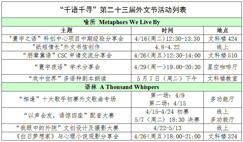 本届外文节活动将分为两大板块:“喻所”(Metaphors We Live By)和“语林”(A Thousand Whispers)。“喻所”板块将涉及各类学术活动。在未来一个月里,外文节将以语言为媒介,带领大家一起探寻不同文化视角下世界所呈现的模样:“纸短情长”将以线上征集外语信件以及线下信件投递的形式呈现;“寰宇夜话”将邀请学院的老师与同学们共同探讨专业学习与复旦精神。“语林”板块则更注重语言的实践性和文娱性,包括“以声会友”配音大赛、“戏中世界”多语种剧本朗读和“我眼中的外院”摄影比赛、观影与文学分享会会等。