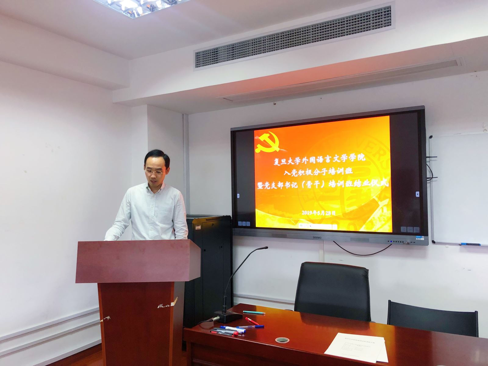 5月27日中午,外文学院分党委在文科楼510会议室举行第三期入党积极分子培训班暨第二期党支部书记(骨干)培训班结业仪式。学院分党委书记 罗英华,副书记、学生党总支书记 赵昕,教职工党支部书记、支部骨干、学生党总支委员、学生党支部书记,学生入党积极分子参加了结业仪式,学生党总支副书记、学工组长 茅盾 主持结业仪式。