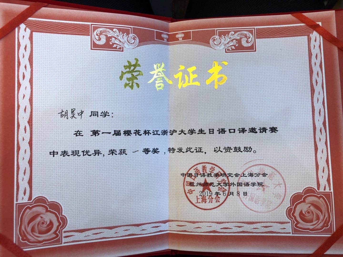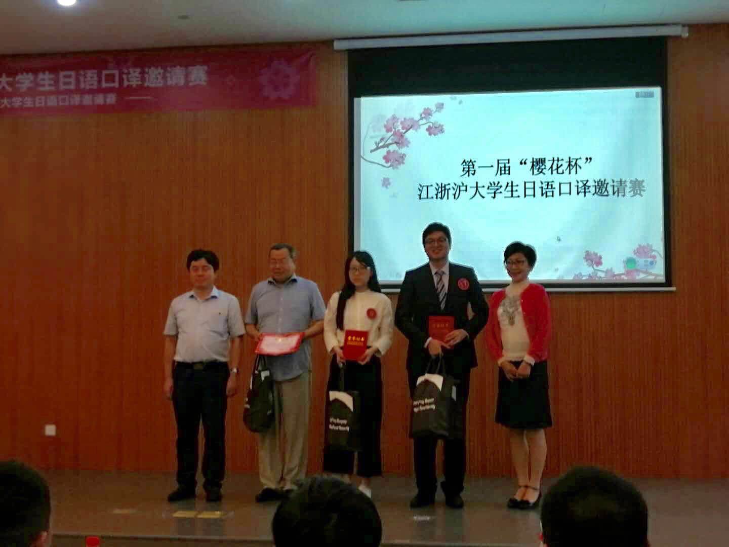6月8日,四年级胡昊中同学在第一届“樱花杯”江浙沪大学生日语口译邀请赛中荣获一等奖,艾菁老师获得优秀指导老师奖。本次有来自江浙沪23所高校的本科生、研究生参赛,胡昊中同学发挥出色,本次比赛的前身为“新世界杯”上海市大学校日语口译邀请赛。朱敏婕同学获得第一届一等奖;周依林同学获得第三届一等奖;俞臻同学获得第四届二等奖。