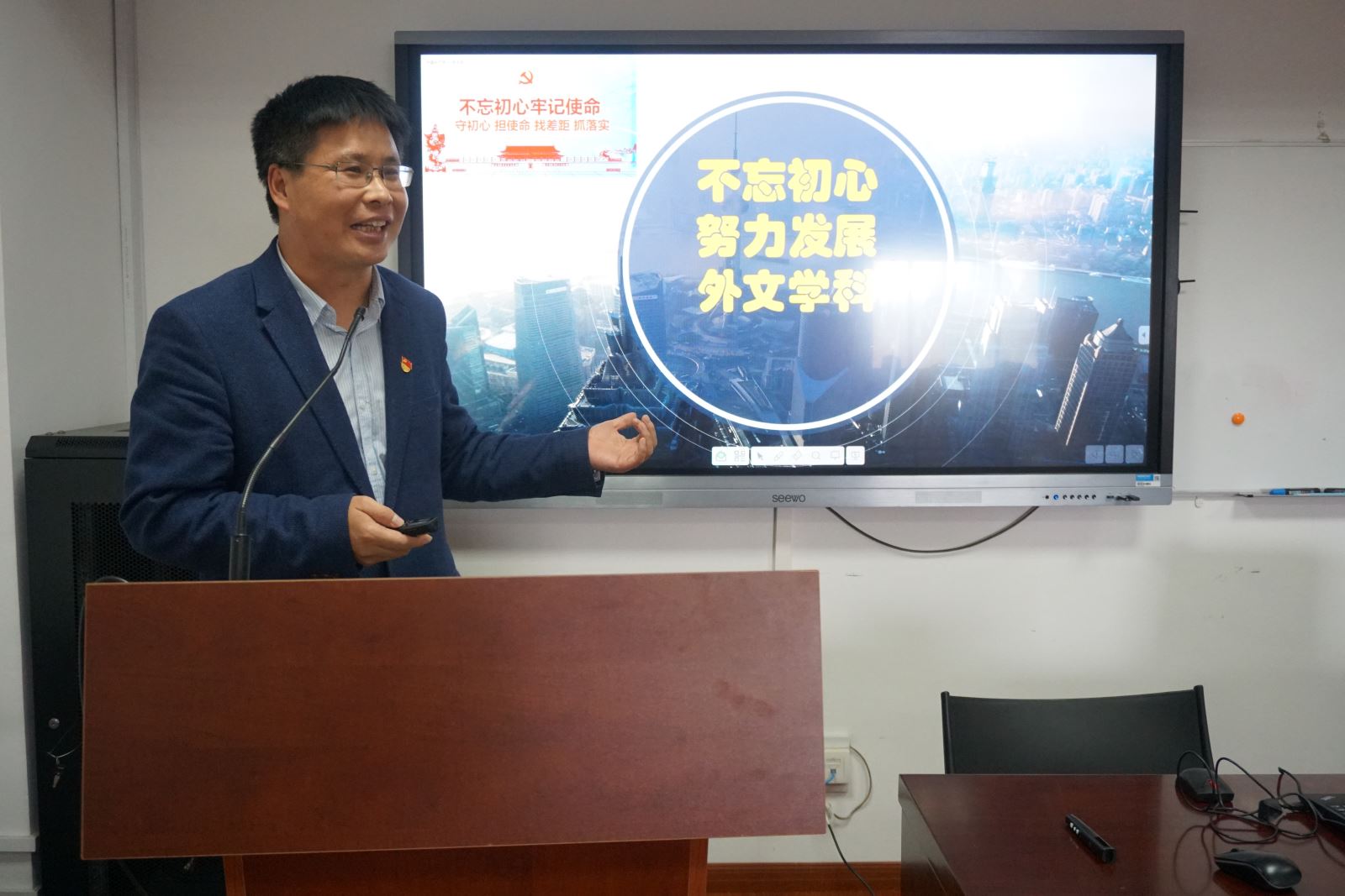 高永伟讲了《不忘初心,努力发展外文学科》专题党课,他阐述了开展主题教育活动、促进理论学习和践行群众路线的重要性,分析了外文学科发展、人才队伍建设等方面面临的形势、机遇与挑战,他强调,外文学院的学科布局与发展有很大的提升空间,要以更加积极的担当作为,在建设一流学科、深化课程改革、人才培养体系、打造一流团队、拓展国际交流等方面进行总体规划,不断加快一流学科建设步伐。