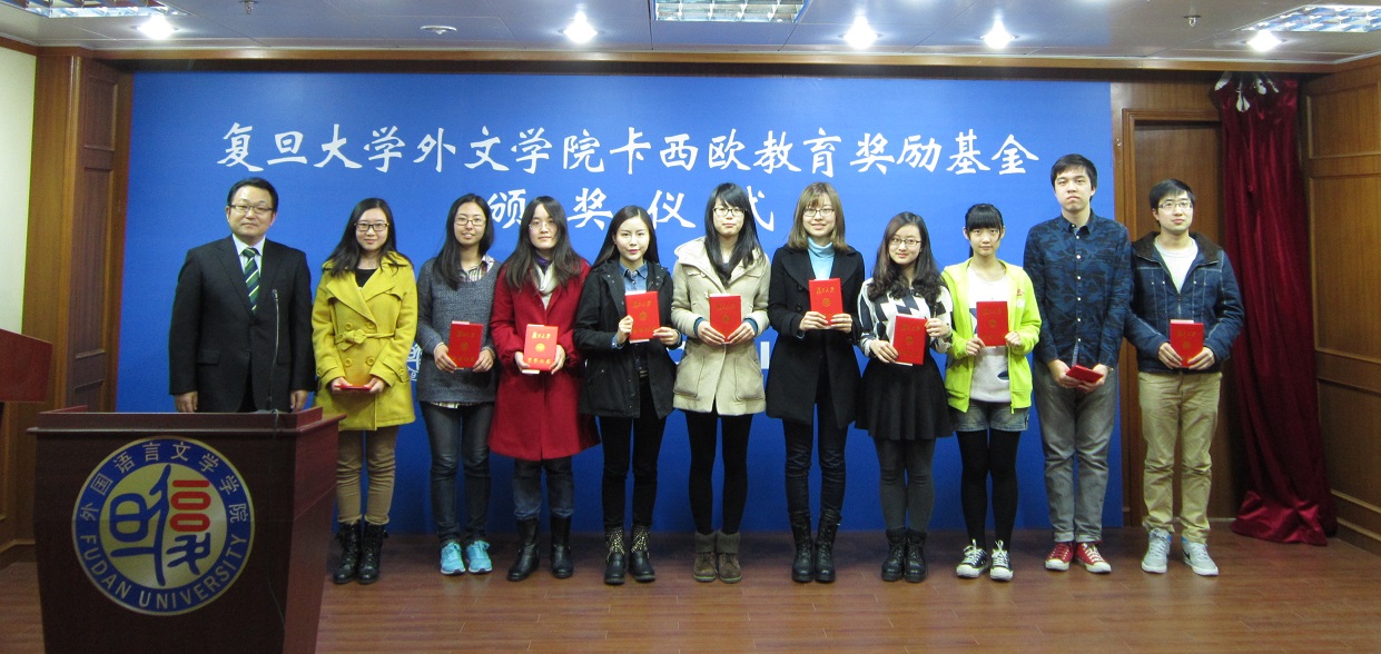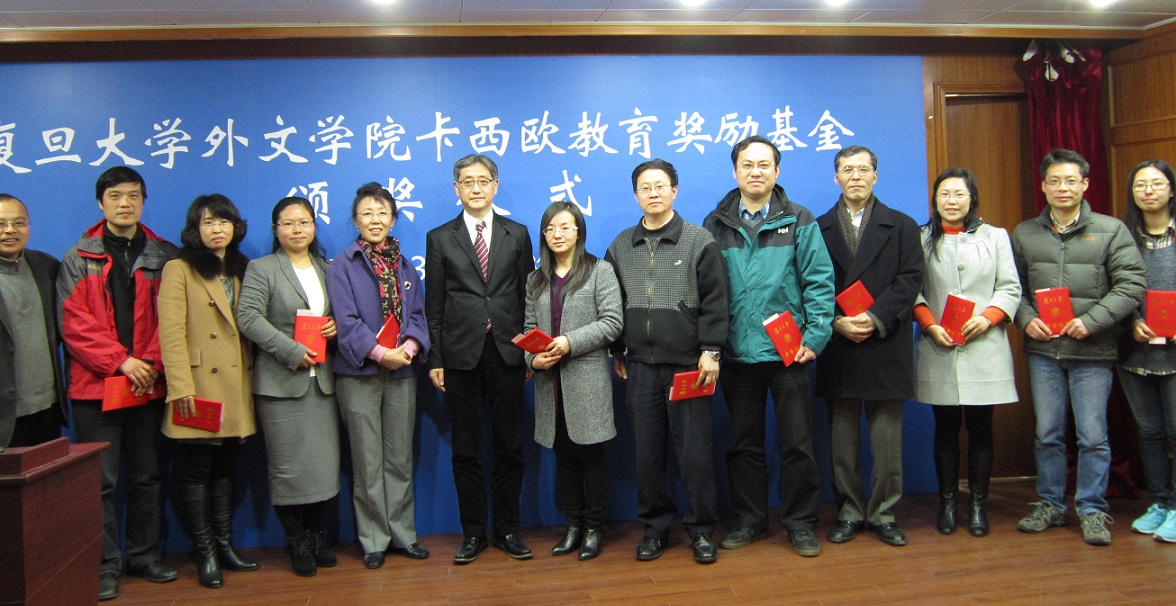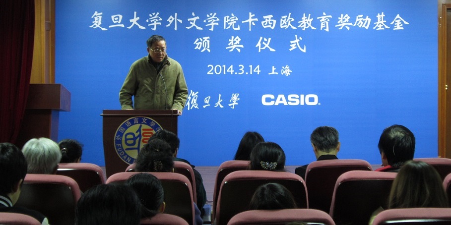 2014年3月14日下午,外文学院在文科楼209室举行2013年度卡西欧奖教金颁奖仪式。出席仪式的有卡西欧(中国)贸易有限公司总经理金田公一、电子词典营业统筹部副总经理岩丸阳一,以及获奖师生。外文学院院长褚孝泉、党委书记李倩、副院长曲卫国、高永伟、党委副书记曾建彬、研工组长王亚鹏也参加了颁奖仪式。仪式由学院副院长高永伟主持。