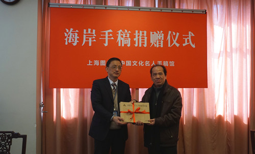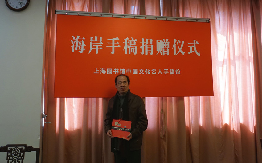 2015年1月19日,上海图书馆中国文化名人手稿馆举行“海岸诗歌翻译/创作手稿”捐赠仪式。上午11点,海岸在家人陪同下走进上图顾廷龙纪念室,继去年10月应约捐赠《狄兰?托马斯诗选》《萨缪尔?贝克特诗选》两部翻译手稿后,今天再次向上图手稿馆捐赠他的《挽歌》(长诗,1991-2012)创作手稿,包括当年创作于中山医院血透室的《挽歌》(组诗)手稿,另最初发表该组诗的《文化与道德》(第三辑,文学卷,现已入藏美国哈佛大学燕京图书馆。上图手稿馆黄显功副馆长接受诗人海岸的捐赠并向他颁发了手稿捐赠证书。