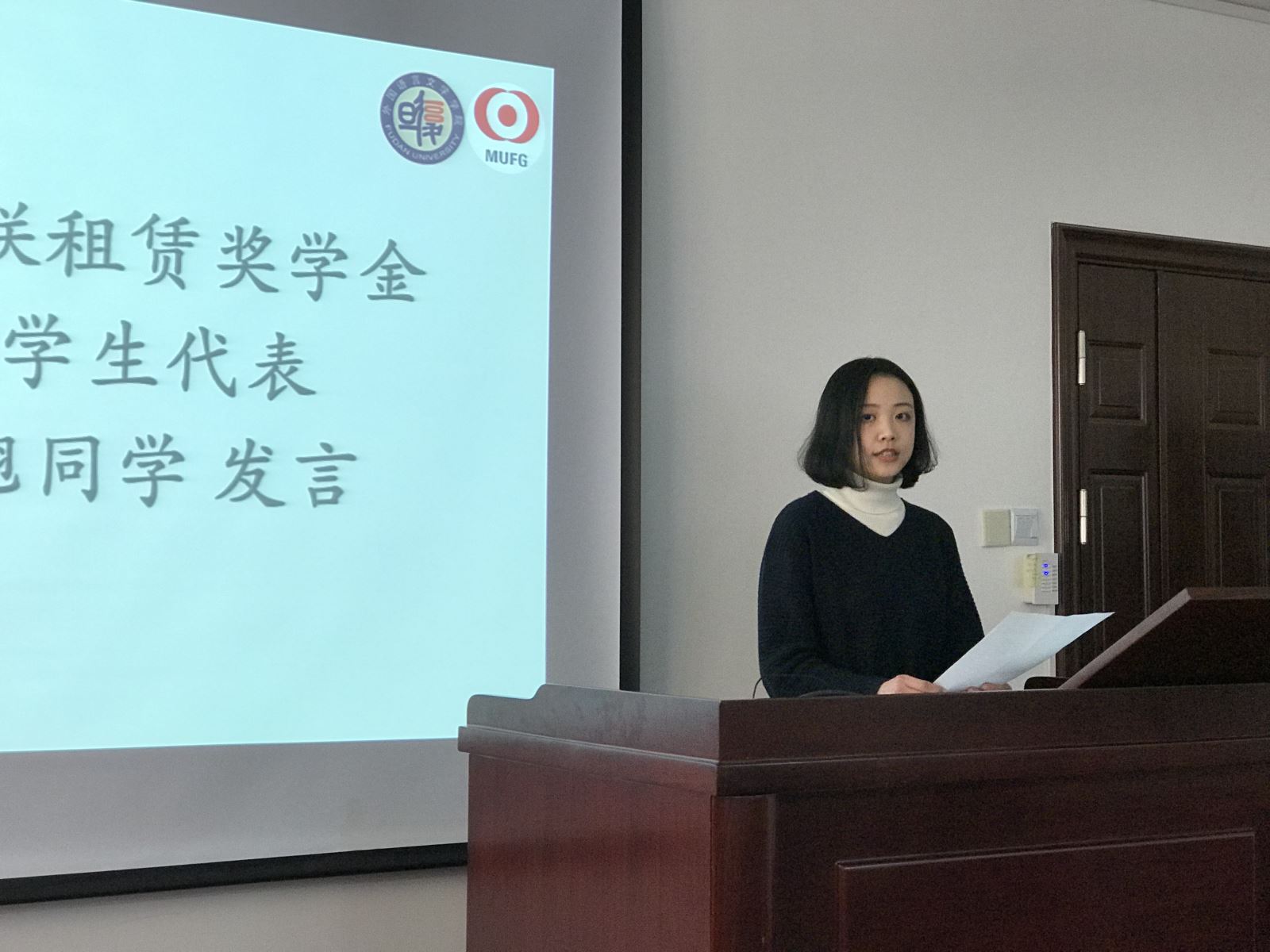 刘炜副院长代表学院致辞,他回顾了双方六年的友好合作,介绍了学院的奖学金评奖机制,表达了对于三菱日联租赁株式会社的感谢和对日文系学子们的殷切期望。