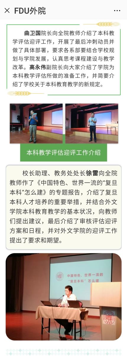 在学校的统一部署下,外文学院坚持“以评促建、以评促改、以评促管、评建结合、重在建设”,全院动员、齐心协力、认真准备、积极迎评,学院本科人才培养工作得到评估专家的肯定与好评。